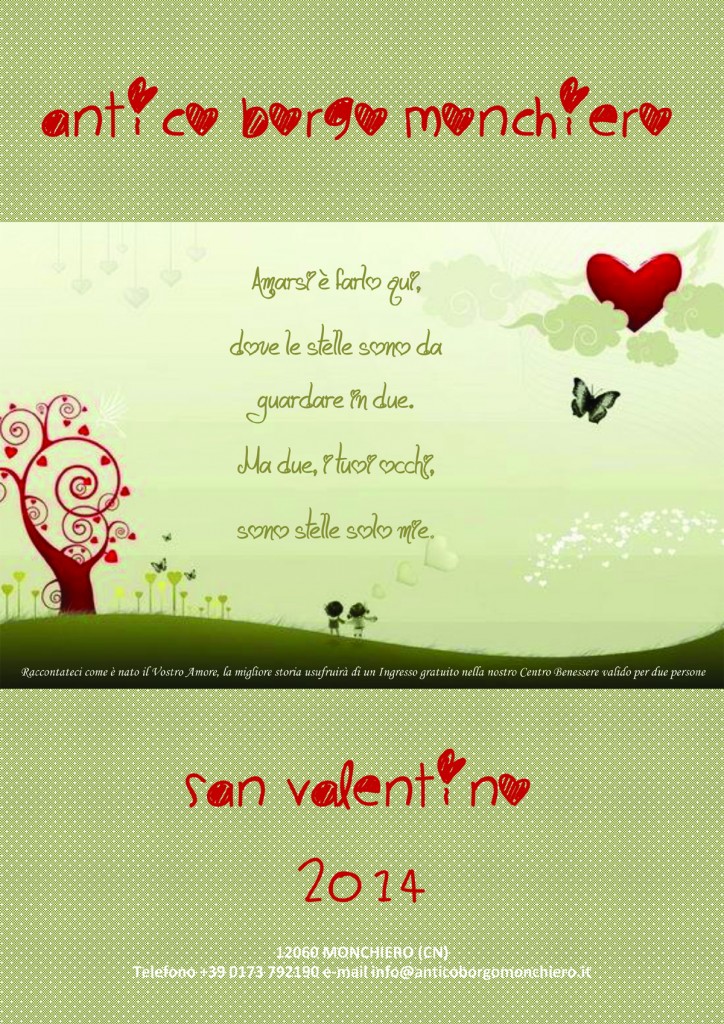 L’Antico Borgo Monchiero mantiene la propria interpretazione di accoglienza cortese anche a San Valentino. Nell’edificio settecentesco sul colle che domina le Langhe tra Monforte e Dogliani, in un’atmosfera riposante, quasi sospesi nel tempo, si raccolgono – e raccontano – le storie degli innamorati, e la più bella viene premiata con l’ingresso al centro benessere Afrodite, con la vasca idromassaggio scavata nel tufo, la sauna e l’area relax, accanto al frutteto e alla piscina. Nel concorso – Raccontateci com’è nato il Vostro Amore – risuona un verso di Amarsi è di Amedeo Minghi, e pare sentirlo riecheggiare tra le spesse mura, magari nella cappella affrescata riservata ai matrimoni: «Amarsi è farlo qui, dove le stelle sono da guardare in due. Ma due, i tuoi occhi, sono stelle solo mie».
